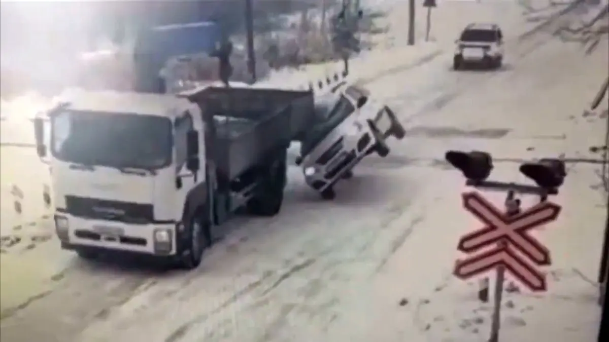 حوادث رکنا: راننده ماشین سواری که برای رد شدن عجله داشت ناگهان به درب کامیون گیر کرد.