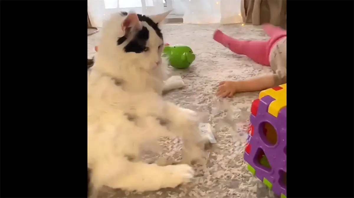 ببینید / لگد زدن عجیب یک گربه به نوزاد بیگناه و دلجویی سگ مهربان + فیلم
