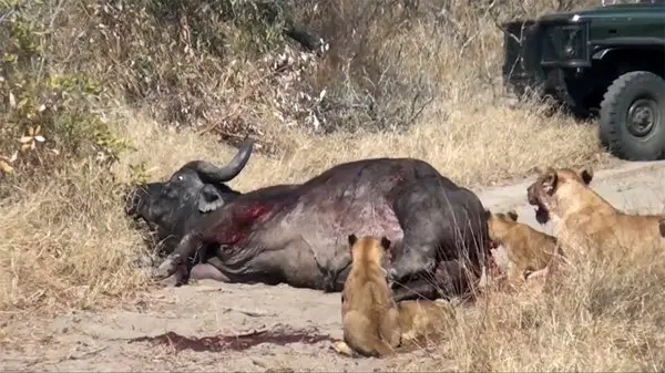 حودث رکنا: در این ویدئو صحنه ای بسیار دلخراش از حمله شیر های وحشی به بوفالو را خواهید دید که قلب آدم را به درد می آورد.