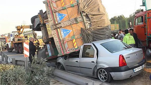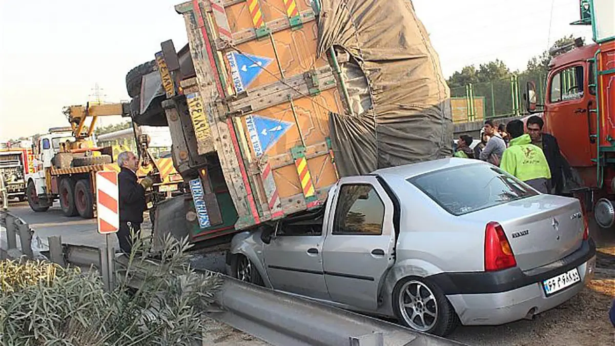 6 ساعت عملیات نفسگیر برای بیرون آوردن راننده از خودروی مچاله شده زیر تریلی / در جاده بم رخ داد + عکس