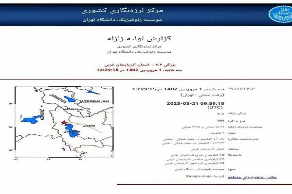 به گزارش رکنا، بر اساس اعلام مرکز لرزه نگاری کشور زمین لرزه‌ای به بزرگی ۳.۶ ریشتر ظهر امروز ساعت ۱۳ و ۲۹ دقیقه شهرستان خوی را لرزاند.