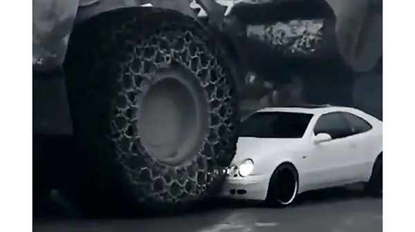 هنگامی که لودر بزرگ معدن تلاش میکند تا یک مرسدس را له کند، قسمت جلوی شاسی اتومبیل از خود مقاومت شگفت انگیزی نشان میدهد.