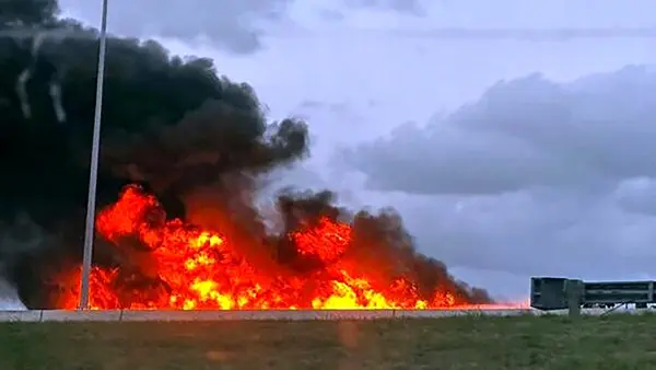 واژگونی و انفجار تریلی ۱۸ چرخ در بزرگراهی در تگزاس + عکس