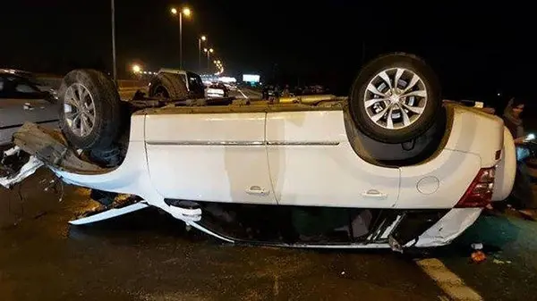 حوادث رکنا: در رفتن تایر کامیون در وسط اتوبان باعث پشتک زدن شاسی بلند به شکلی ترسناک شد.