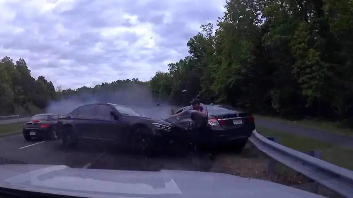 این ویدئو که توسط پلیس کانتی فیرفکس منتشر شده است، خودرویی را نشان میدهد که با سرعت زیاد در حال عبور از خطوط متعدد به سمت دیگر جاده و برخورد به خودرویی که در امتداد شانه متوقف شده است.