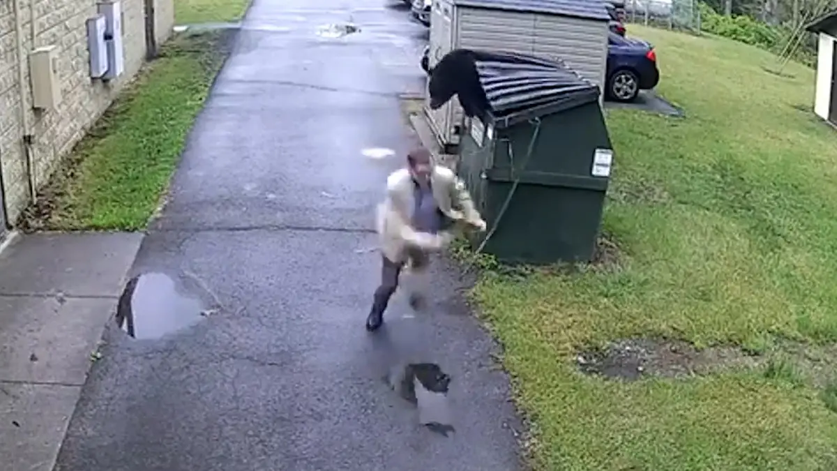 فیلم جالب از نجات خرس گرفتار از سطل زباله / مرد شجاع پا به فرار گذاشت