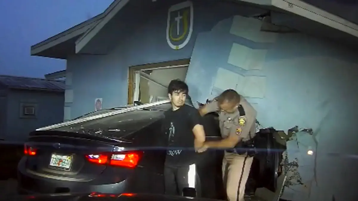ویدئوی دوربین های نظارتی افسران پلیس از گشت بزرگراه فلوریدا نشان میدهد که ماشین از جاده منحرف شده و تمام قسمت جلویی خود را به کلیسا میکوبد.