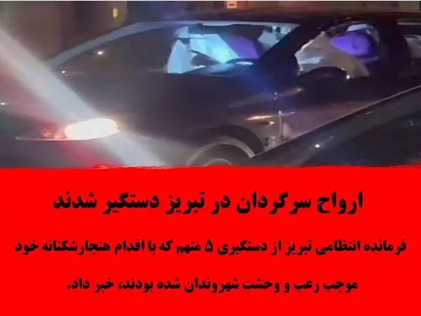 به گزارش رکنا از هشترود؛ سرهنگ "رمضان الهوردیان" در تشریح این خبر اظهار داشت:ماموران کلانتری 17 ولیعصر تبریز هنگام گشت زنی در حوزه استحفاظی مشاهده می کننددر یکی از خیابان های منطقه ولیعصر تبریز 5 نفر جوان با استفاده از پارچههای سفید و عینک دودی خود را شبیه به روح کرده و از این طریق در پی جلب توجه و رعب و وحشت دیگران بودند که ماموران بلافاصله خودرو را توقیف و متهمان را دستگیر و به کلانتری منتقل کردند.