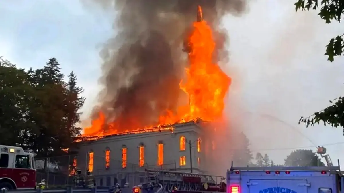 ببینید / آتشسوزی مهیب یک کلیسای ۱۶۰ ساله پس از اصابت صاعقه! + فیلم