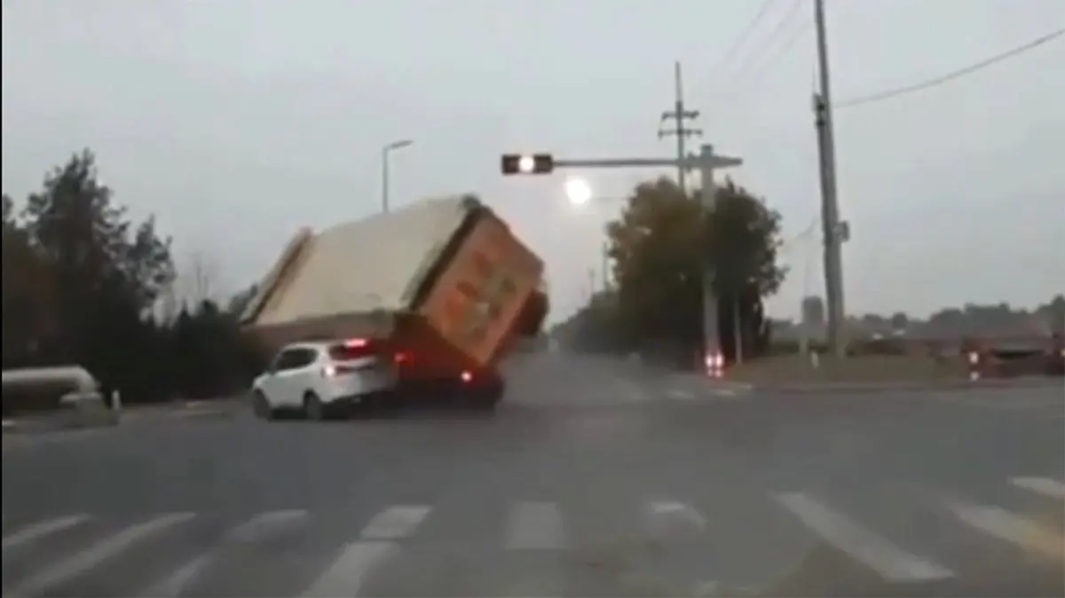 ببینید/ لحظه هولناک چپ کردن یک کامیون و له شدن یک خودروی شاسی بلند! + فیلم