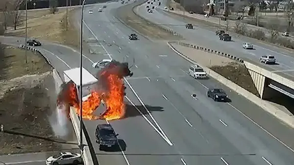 حوادث رکنا: دوربین اداره حملونقل مینهسوتا در ایالاتمتحده لحظه برخورد یک خودرو با کامیون و وقوع آتش از خودرو کامیون را ثبت کرده است.