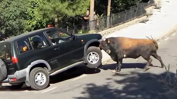 ببینید / حمله ویرانگر یک گاو خشمگین به خودروی سوزوکی مقابل چشم مردم + فیلم