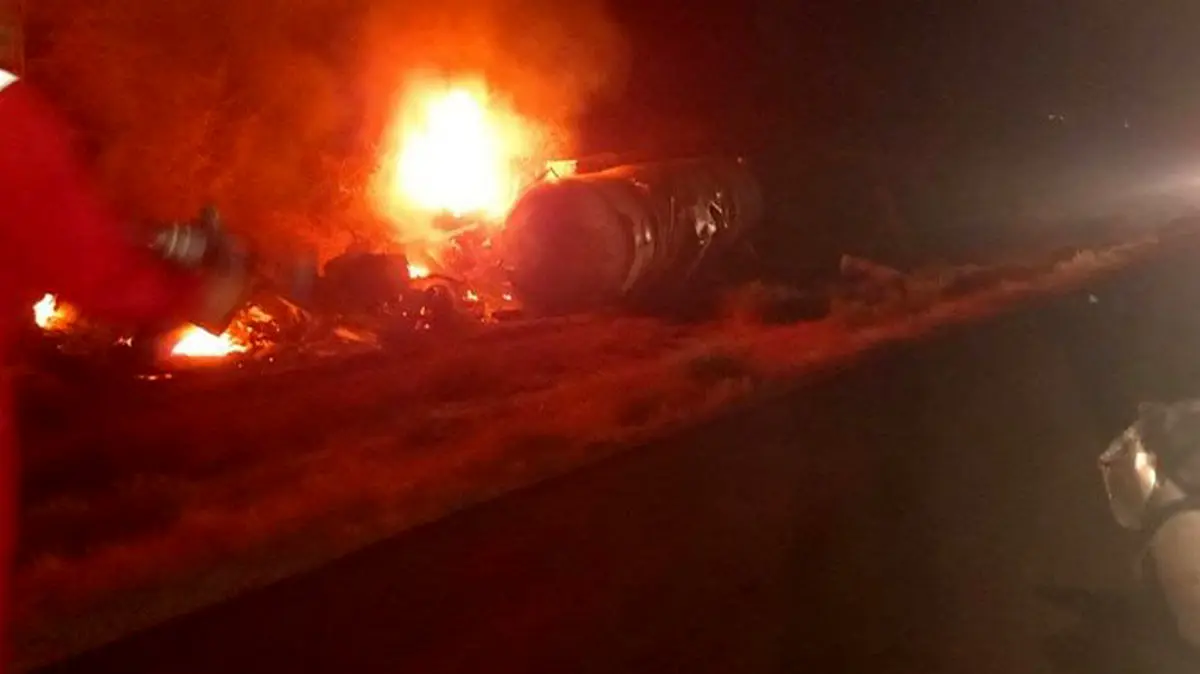 عکس تصادف آتشین 2 تریلی حمل گاز/ تانکر بیرون جاده پرتاب شد