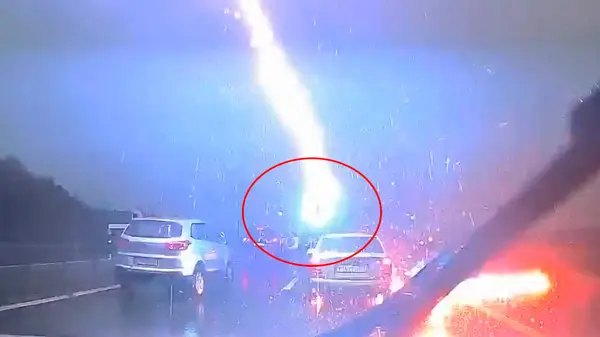 فیلم باورنکردنی از لحظه هولناک برخورد رعد و برق با یک خودرو در وسط اتوبان / شوکه می شوید