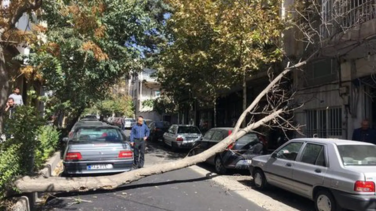 سقوط چندین درخت و تیرچراغ برق در طوفان عصر امروز تهران + جزییات