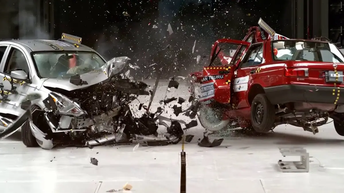 ببینید / لحظه پودر شدن یک خودروی سواری بعد از تصادف شدید با یک خودرو و برخورد به تیر برق!