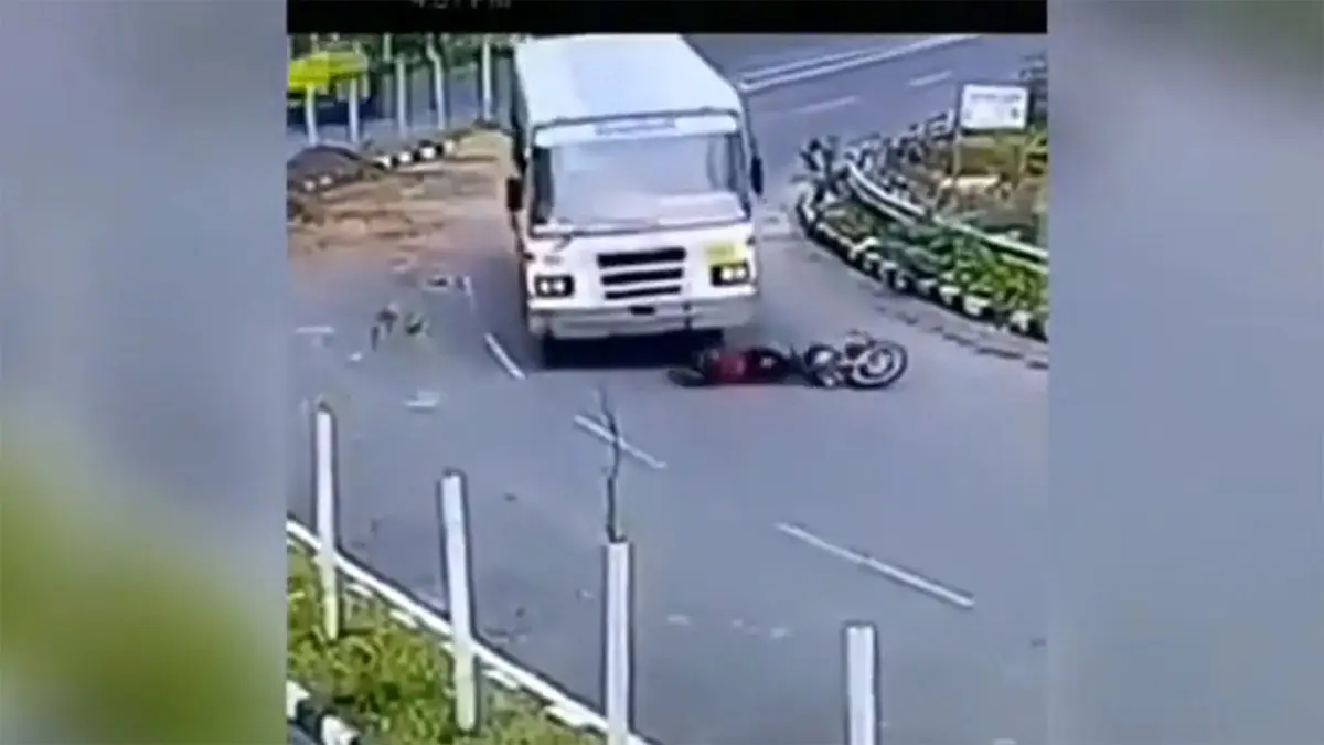 ببینید | معجزه مقابل لنز دوربینها؛ لحظه زنده ماندن موتورسوار با وجود عبور چرخهای اتوبوس از روی بدنش!
