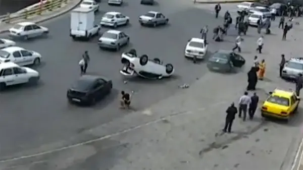 ببینید / تصادف عجیب دو خودرو در میدان ۷۲ تن قم و خوش‌شانسی عابرین
