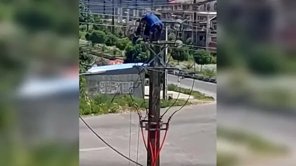 صحنه برق گرفتگی سیمبان اداره برق انزلی بالای دکل برق فشار قوی / همکارش اشتباه کرد + فیلم
