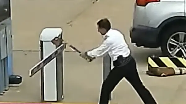 ببینید / حمله جنونآمیز خلبان به گیت پارکینگ با تبر؛ لحظه دستگیری توسط پلیس!