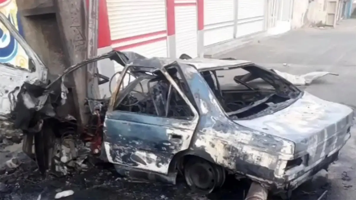 انفجار وحشتناک خودرو در پی برخورد با تیربرق / پرت شدن راننده به بیرون خودرو جانش را نجات داد + عکس و فیلم