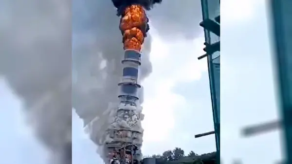 ببینید / لحظه ریزش برج پالایشگاه گوگرد در نیروگاه حرارتی هوافو چین پس از آتش سوزی شدید
