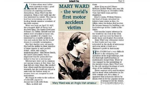 رکنا: اولین سانحه رانندگی هم سال ۱۸۶۹ رخ داد. قربانی این تصادف هم «مری وارد»، یکی از دانشمندان خانم برجسته ایرلندی بود.