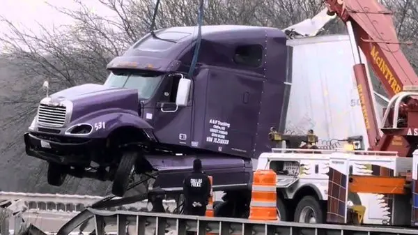 حوادث رکنا: بیاحتیاطی راننده تریلی در رعایت سرعت و مهار نکردن مناسب، موجب واژگون و سقوط ار روی پل شد.