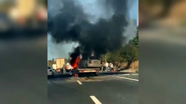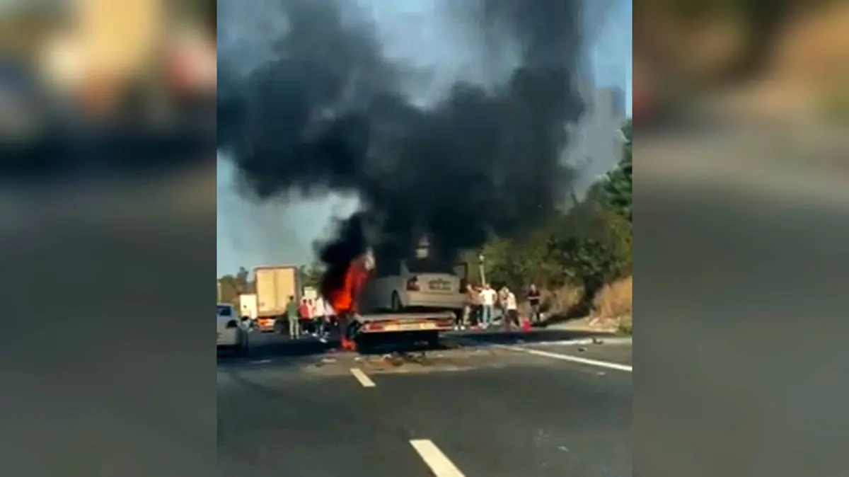 ببینید / اولین تصاویر از آتش گرفتن یک خودروی سواری روی ماشین یدک‌کش بعد از تصادف با کامیون وسط اتوبان