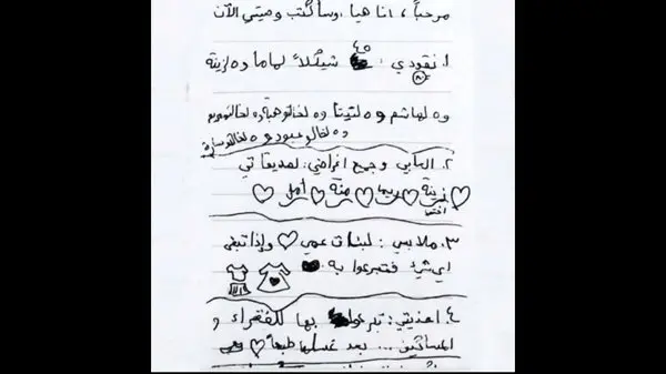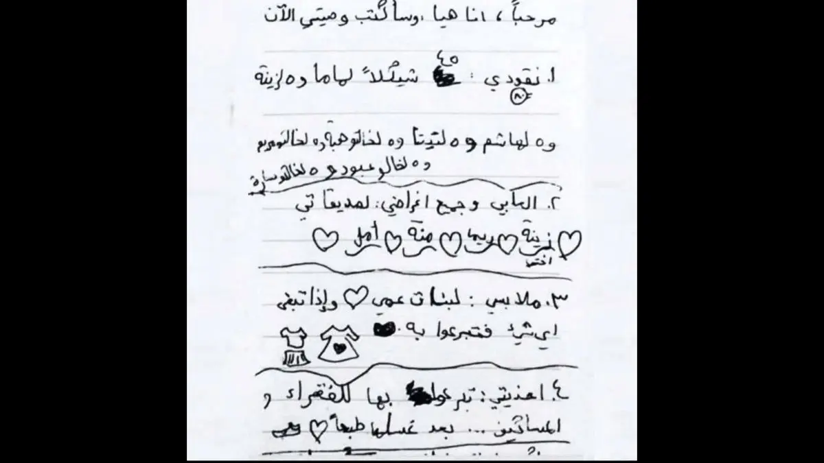 به گزارش رکنا: یک دختر بچه فلسطینی در یک وصیت نامه کوتاه تمام خواسته هایش از این زندگی را به سادگی بیان کرده است. باهم وصیت نامه را می خوانیم: