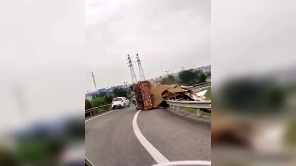 ببینید / لحظه چپ شدن عجیب یک کامیون سر پیچ در جاده!