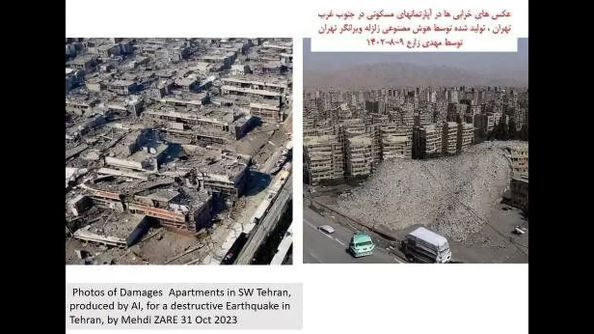 مهدی زارع با انتشار این تصاویر در صفحه اینستاگرام خودش نوشت: اینها تصاویری است که با شبیهسازی بخشهای مختلف در نزدیکی تهران برای یک زمین لرزه با بزرگای ۷ ریشتر توسط هوش مصنوعی تولید شده است.
