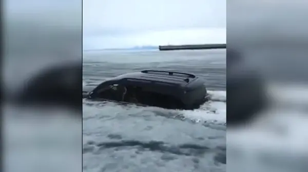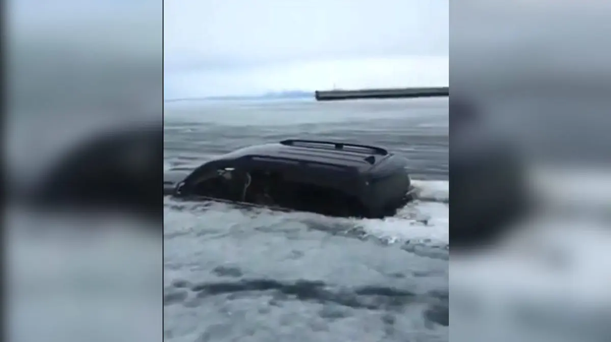 ببینید / غرق شدن تویوتا لندکروز در دریاچه یخ زده