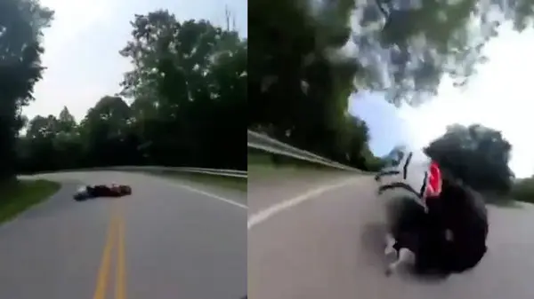حوادث رکنا: ویدئویی از سر خوردن موتورسوار بعد از تصادف در امتداد جاده را ببینید.