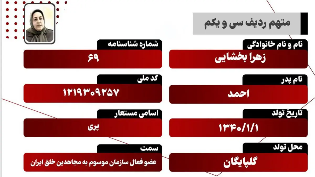 به گزارش رکنا، زهرا بخشایی فرزند احمد متهم ردیف سیویک دادگاه رسیدگی به جرایم گروهک تروریستی منافقین است.