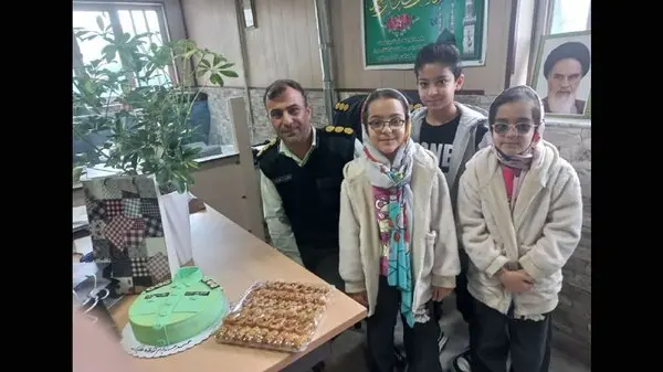 بچه ها با ذوق و شوق ظرف شیرینی و کیک قشنگی که طرح لباس زیبای پدرشان است روی میز می گذارند.