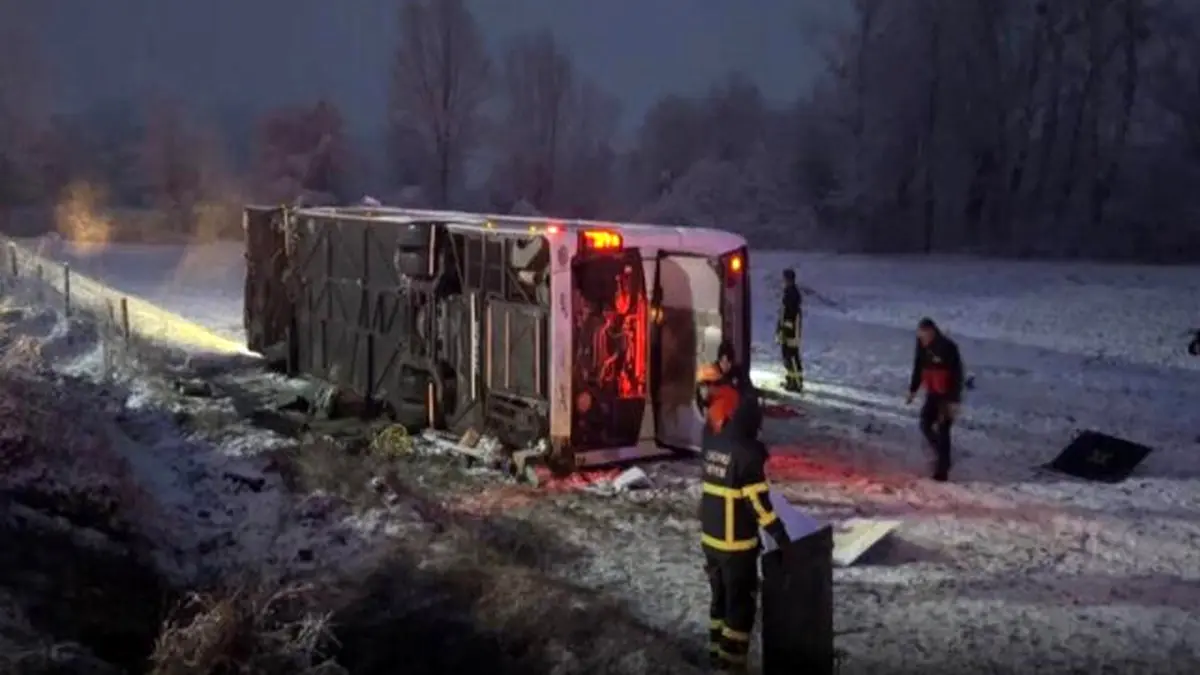 این اتوبوس که راننده آن هنوز شناسایی نشده حین رانندگی از مسیر منحرف و در یک منطقه روستایی واژگون شده است.