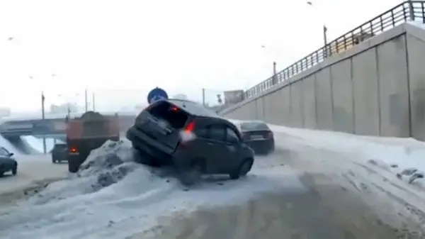 ببینید | تغییر مسیر ناگهانی راننده خودروی سواری در جلوی کامیونِ در حال حرکت!