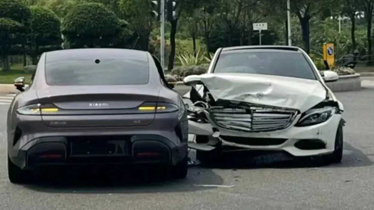 در این تصویر، خودرو SU7 غول چینی با یک مرسدس بنز سدان سفید رنگ تصادف کرده و باعث آسیب خودرو بنز شده است.