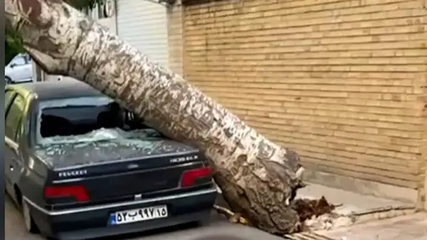 مچاله شدن ماشین مرد بد شانس تبریزی در سقوط درخت خیلی بزرگ + فیلم