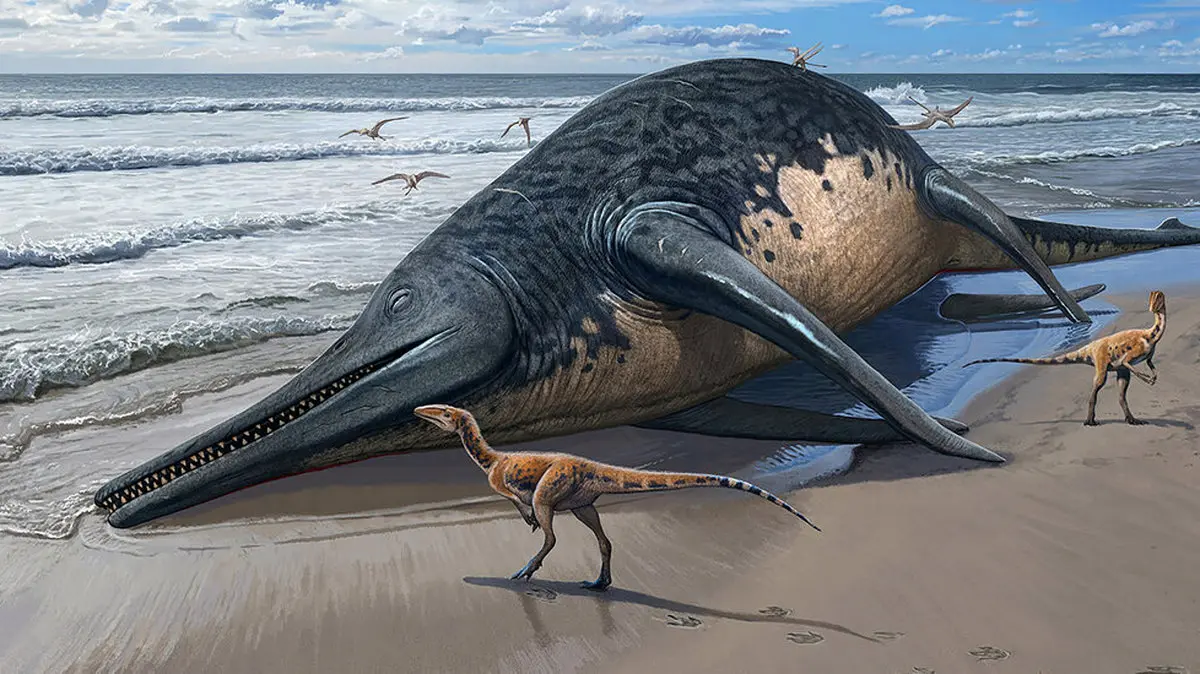 این جانور ماقبل تاریخ همچنین به اندازه طول یک نهنگ آبی است که آن را به یکی از بزرگترین خزندگان دریایی ثبت شده تبدیل می کند. ایکتیوسور حدود ۲۰۲ میلیون سال پیش در عصر دایناسورها در دریاها زندگی می کرد. قطعه دیگری از این جانور قبلاً توسط کارشناس موزه حیات دریایی ژوراسیک در سال ۲۰۱۶ در امتداد ساحل سامرست کشف شده بود.