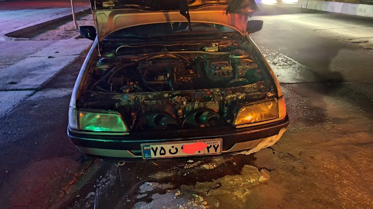 آتش گرفتن خودروی پژو و حضور سریع آتش نشانان در محل حادثه