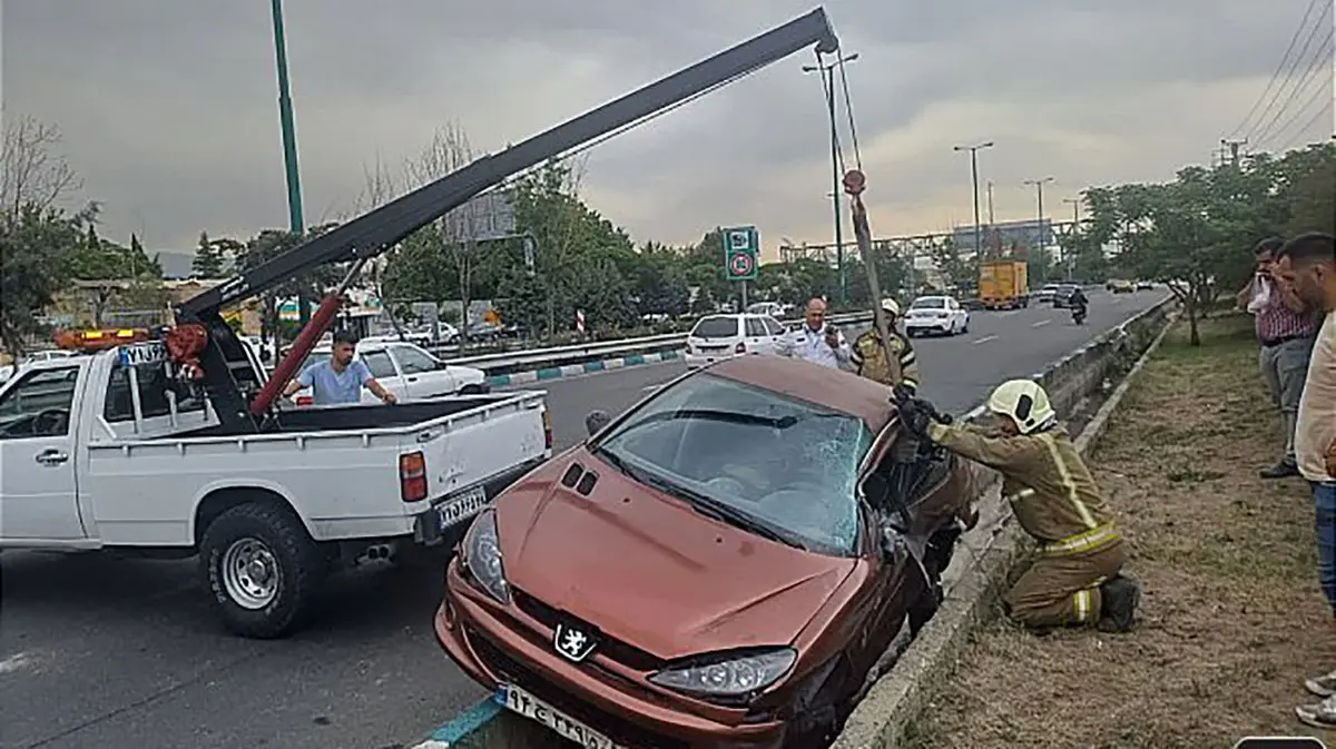 پرتاب شدن راننده در جوب بعد از برخورد با گاردریل در بزرگراه شهید لشگری + عکس
