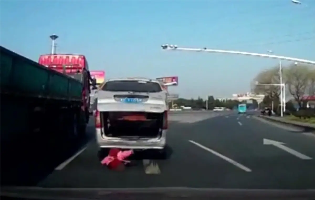 در این فیلم ویدیویی میبینیم پدربزرگ در حال رانندگی با اتومبیل ون خود است که ناگهان در پشتی ون باز شده و این بچه 2 ساله از آن به بیرون میافتد. کودک که بشدت وحشت کرده در طول بزرگراه به دنبال خودروی پدربزرگش میدود. خوشبختانه این کودک چینی بسیار خوششانس بوده که در این فاصله اتومبیل دیگری از راه نرسیده تا او را زیر بگیرد؛ اما در همان لحظات 2 کامیون از سمت چپ و یک اتوبوس از سمت راست کودک از راه میرسند و از دو سویش میگذرند. در همین حال چند موتورسوار و راننده خودروی پشتی که در حال فیلمبرداری از این صحنه بودند متوقف شدند و کودک وحشتزده و شوکه شده را که در حال فرار بود در آغوش گرفتند و او را صحیح و سالم به پدربزرگش تحویل دادند.