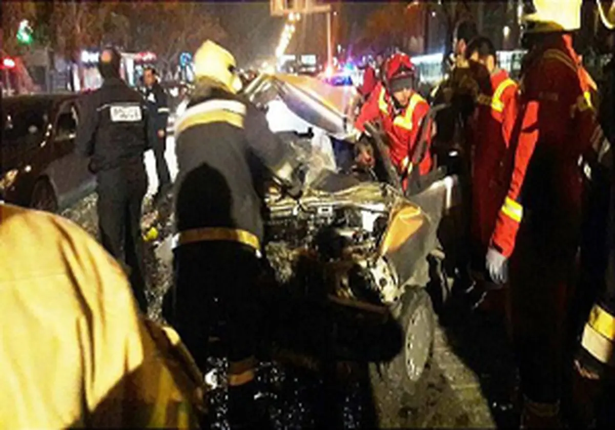 برخورد شدید پراید با گاردریل در بزرگراه رسالت/ راننده سالخورده در اتاقک درهم پیچیده خودرو محبوس شد