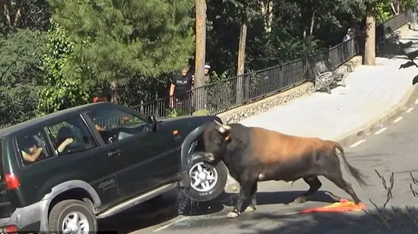 در این ویدئو این گاو چند بار با شاخ خود به قسمت جلوی این خودرو ضربه می زند و سرانجام موفق به از کار انداختن چرخ های جلوی این خودرو می شود. در ادامه در حالی که امکان واژگون شدن این خودرو توسط این گاو وجود دارد چند تماشاچی دیگر سعی می کنند تا توجه این گاو را به خود جلب کرده و آن را از خودرو دور نمایند.