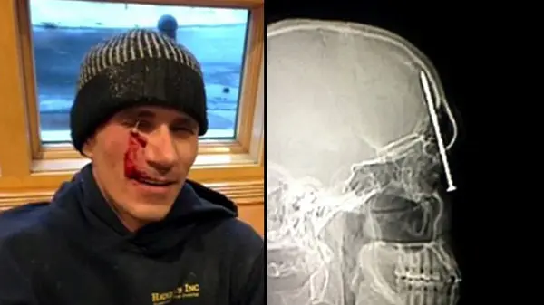نیک تامسون کارگر ساختمانی اهل استیلواتر مینسوتا همراه با دوست خود در حال درست کردن یک کمد چوبی بودند که با استفاده از ابزار میخ کوب خودش یک میخ را به سمت صورت خود زد.