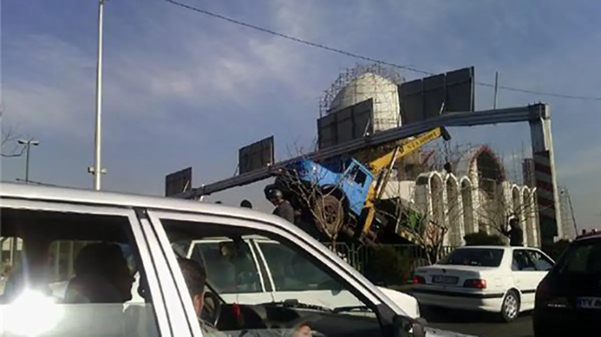 عکس دیدنی از برخورد جرثقیل با تابلو مسیرنما در اتوبان کرج