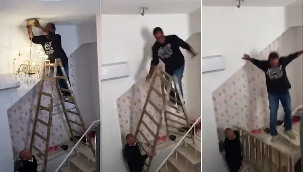 مردی که برای تعمیر لوستر به بالای نردبان رفته بود با افتادن این وسیله روشنایی از سقف از بالای نردبان به پایین سقوط Fall کرد. این لوستر به گونه ای از سقف جدا شد که به انگشت مردی که نردبان را نگهداشته بود نیز صدمه زد. این مرد که برای ثانیه ای نردبان را رها می کند منجر به برهم خوردن تعادل مردی که بالا هست، می شود در نتیجه دوستش از ارتفاع سقوط آزاد می کند. به رغم افتادن قربانی از نردبان، دوستش انگشت خود را نگه داشته و برای کمک عجله نمی کند. این فیلم توسط یکی از کاربران توئیتر از گلاسکو، اسکاتلند آپلود شده و تا الان بیش از صدها بار مشاهده شده است. برای ورود به کانال تلگرام ما کلیک کنید.