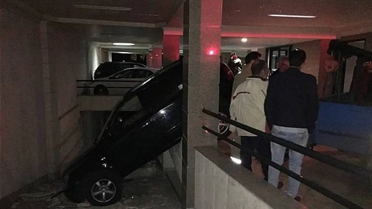 رکنا: خودروی گرانقیمت پس از برخورد با دیواره پارکینگ و تخریب آن به «رمپ» ورودی پارکینگ سقوط کرد.